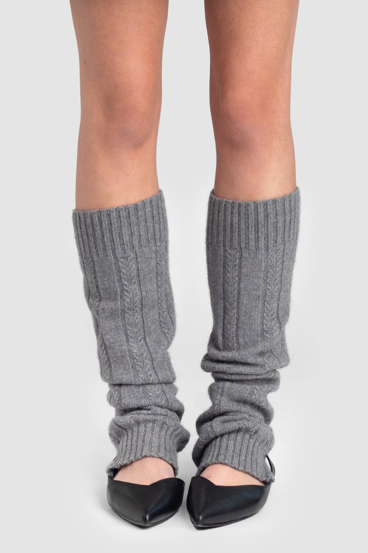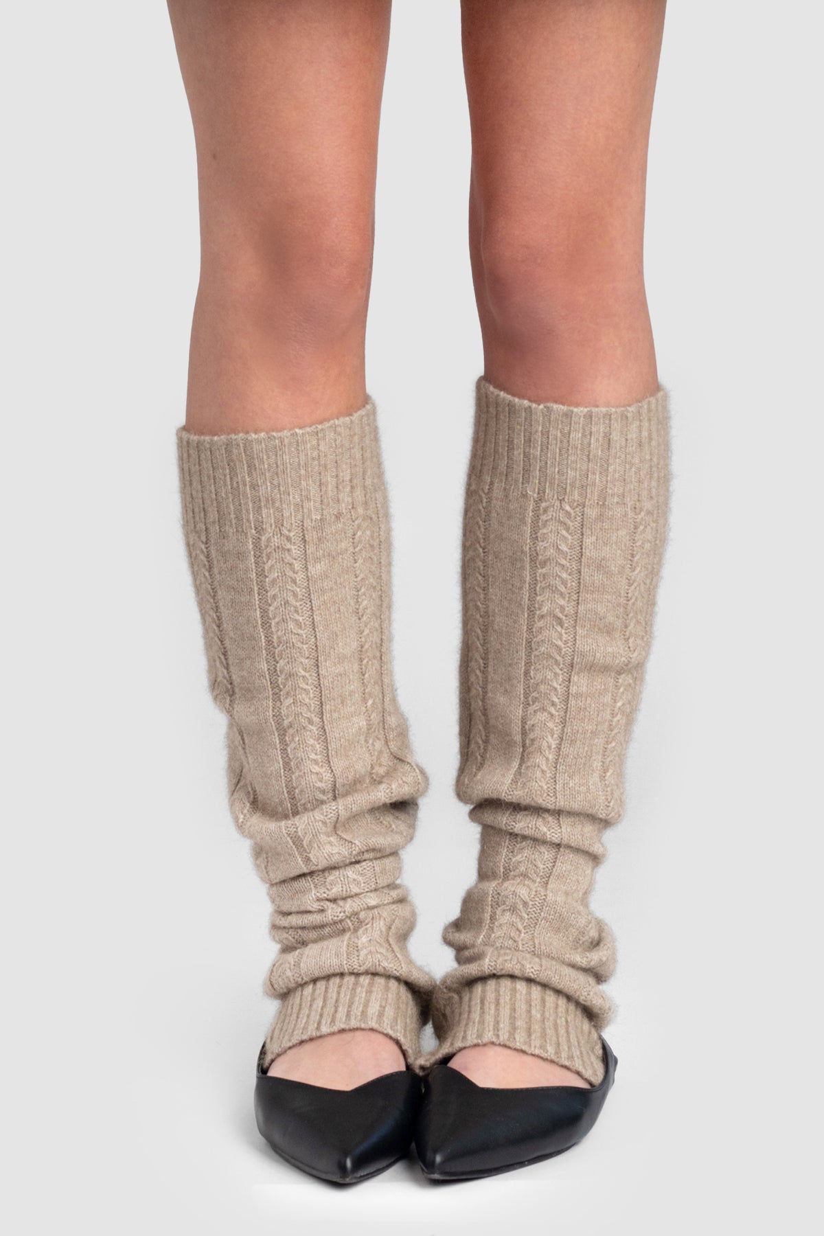 Cable knit leg warmers with a cable, rib design. Made from soft and naturally insulating possum merino silk blended yarn on Waiheke Island.