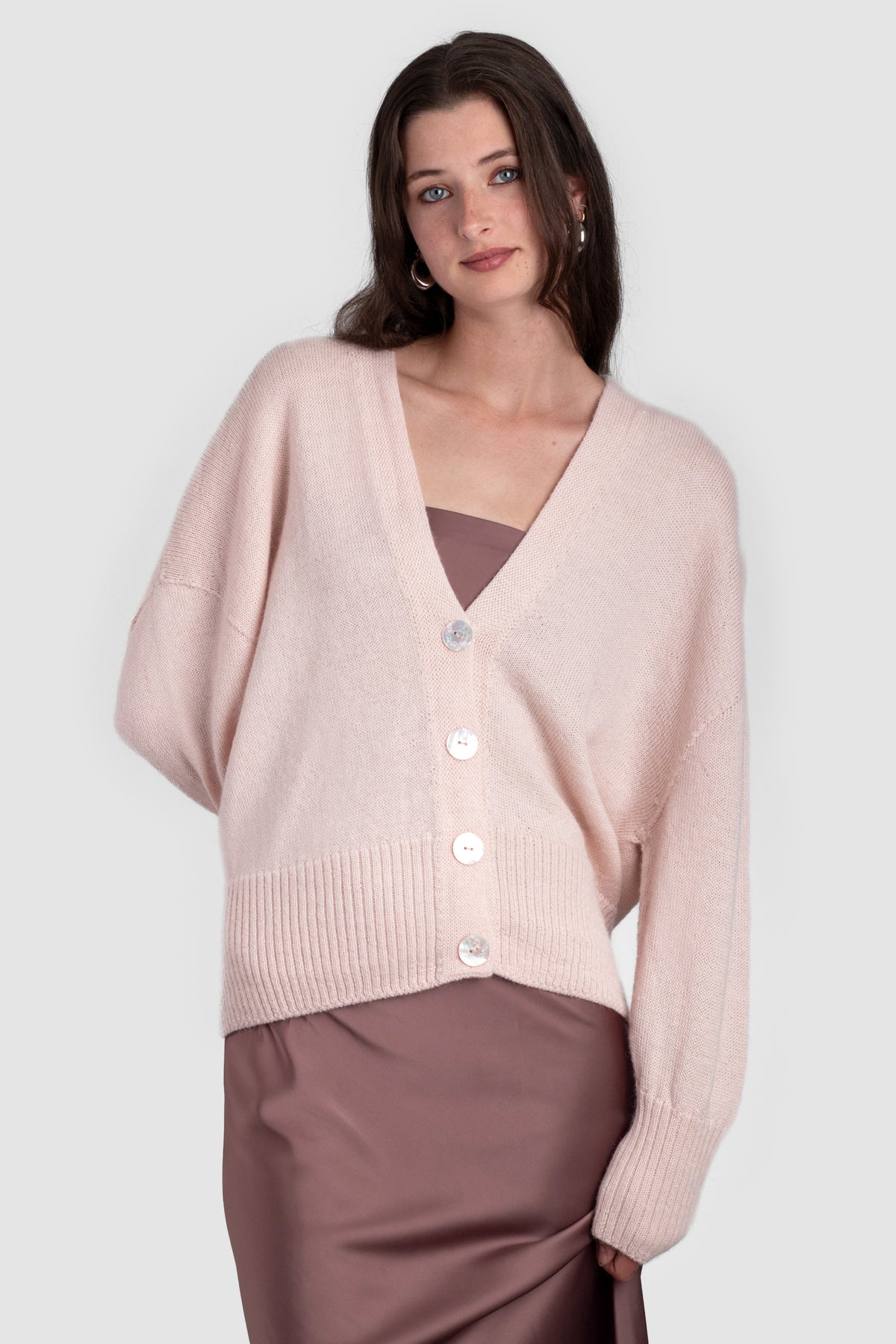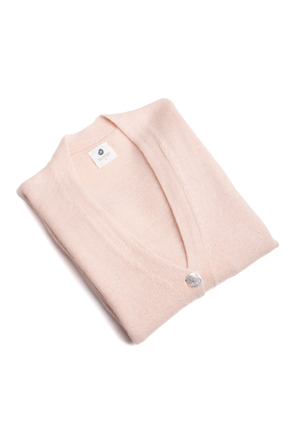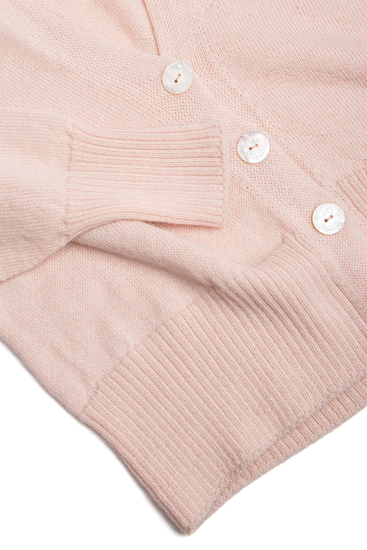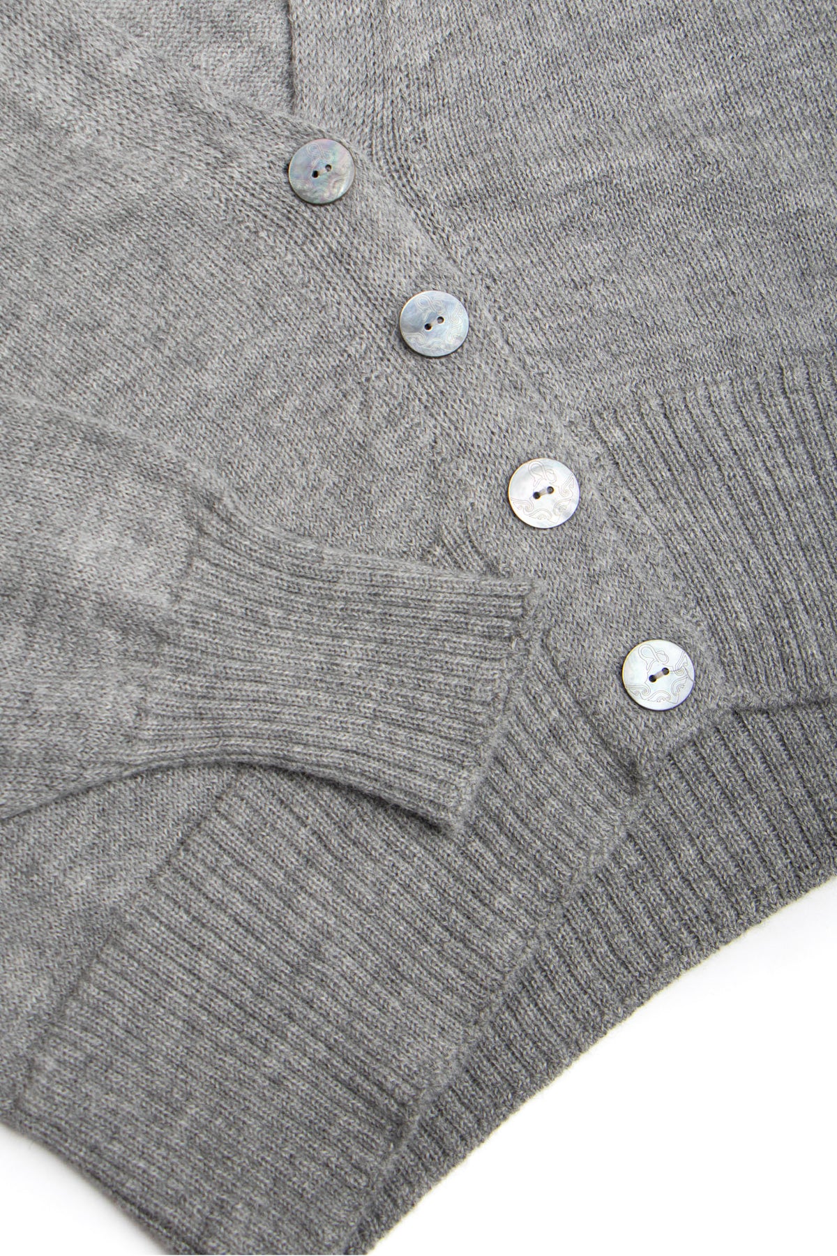 A v-neck cardigan in plain knit, with ribbing around the cuff and hem. Featuring four Ahipao mother-of-pearl stingray buttons.