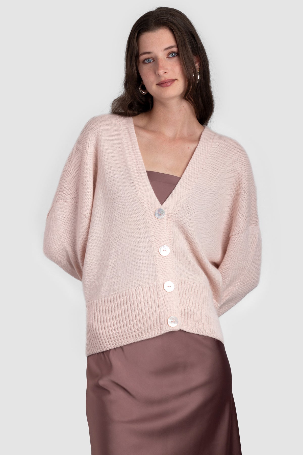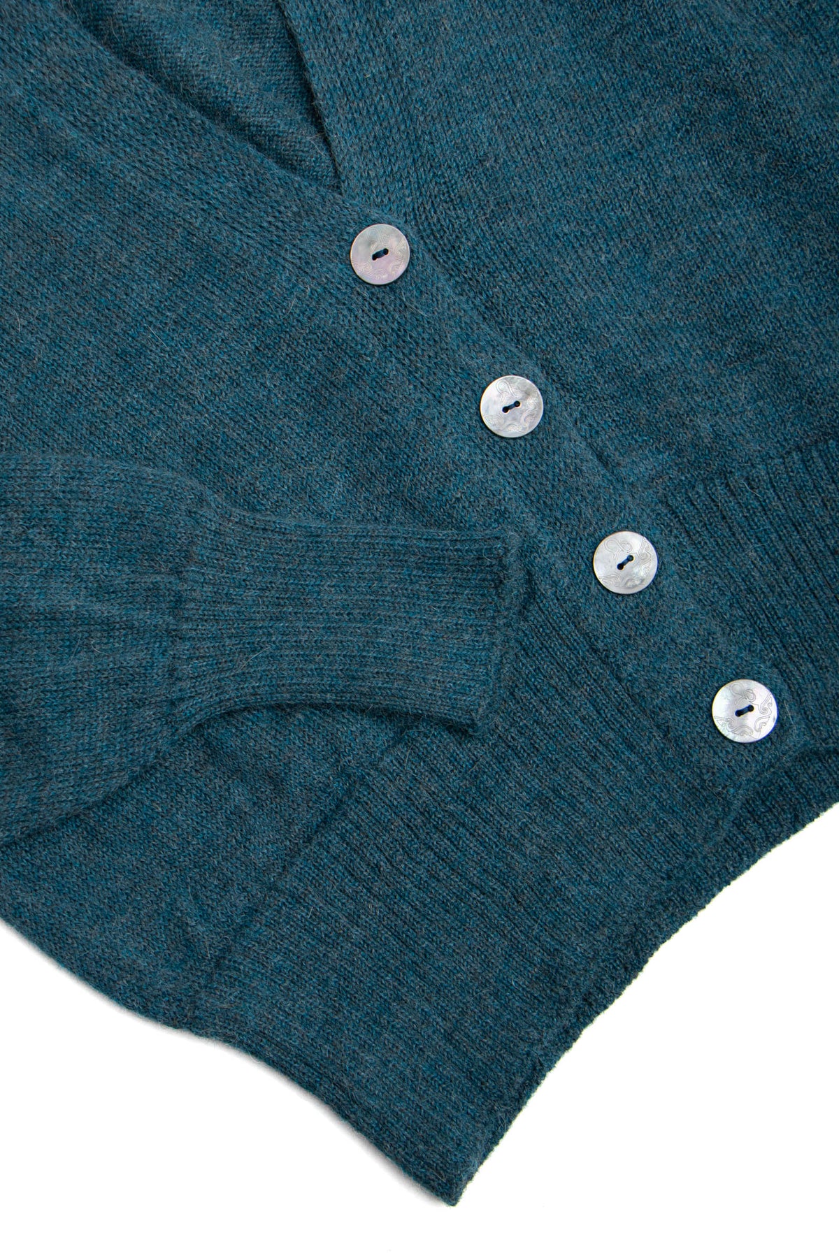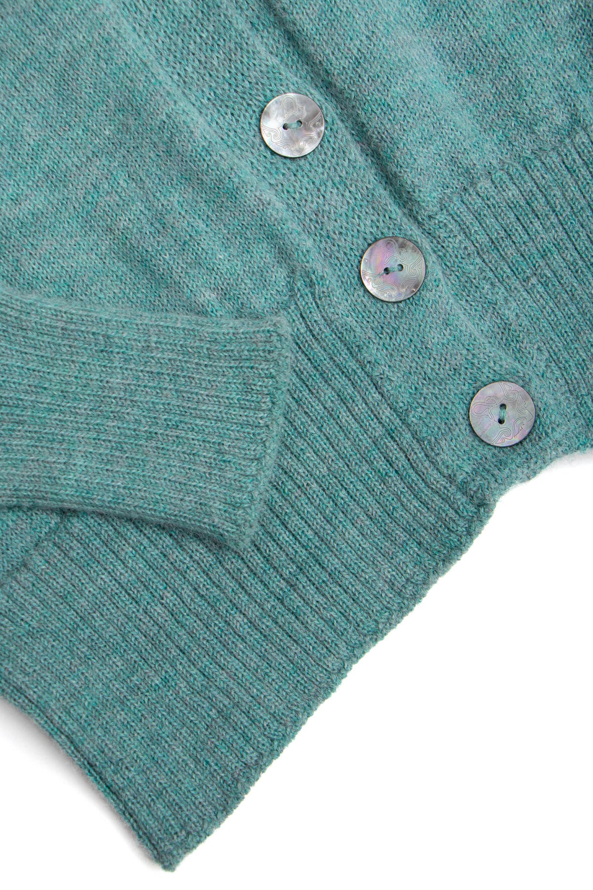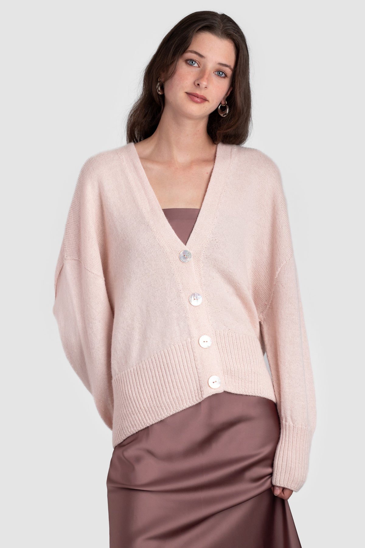 A v-neck cardigan in plain knit, with ribbing around the cuff and hem. Featuring four Ahipao mother-of-pearl stingray buttons.