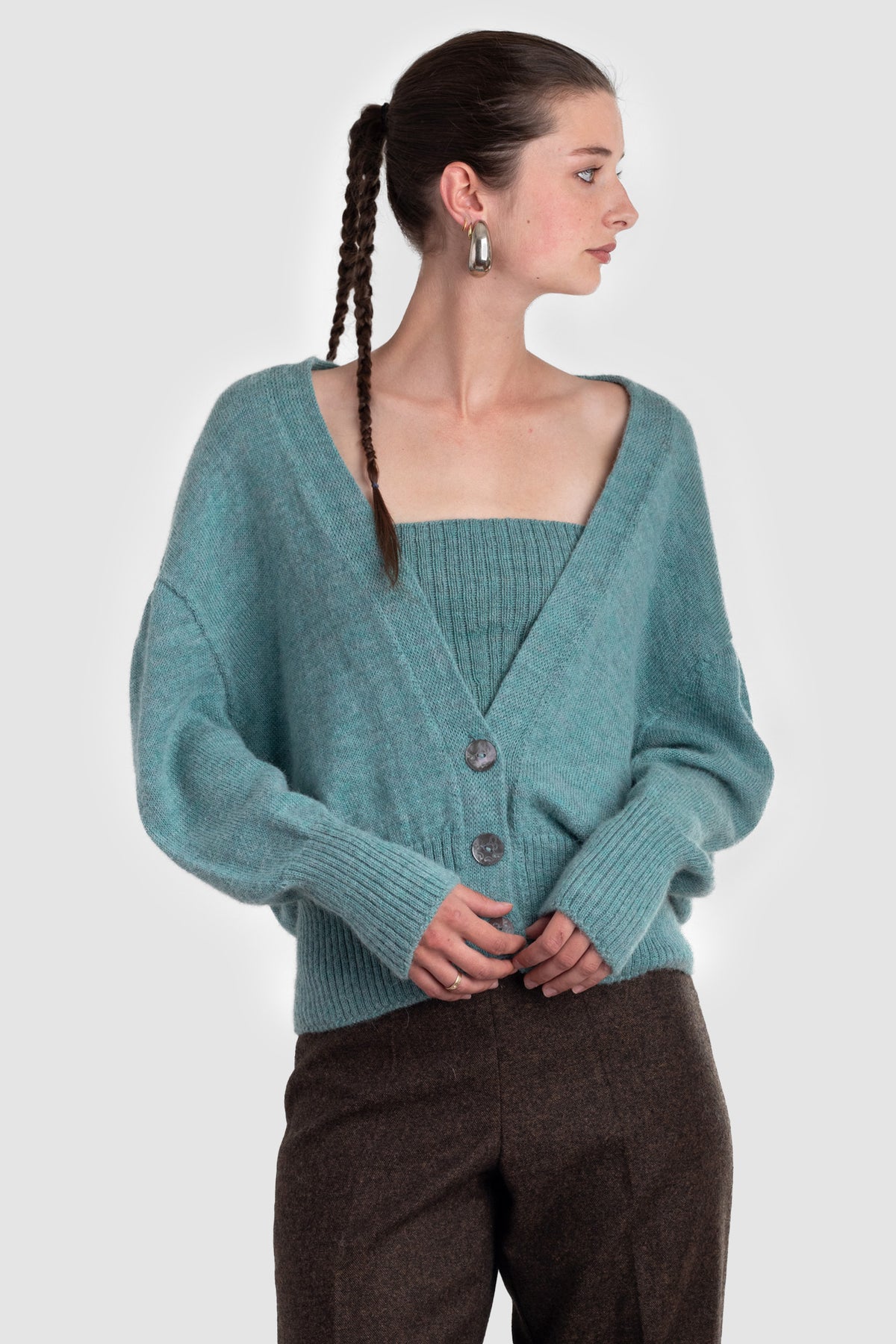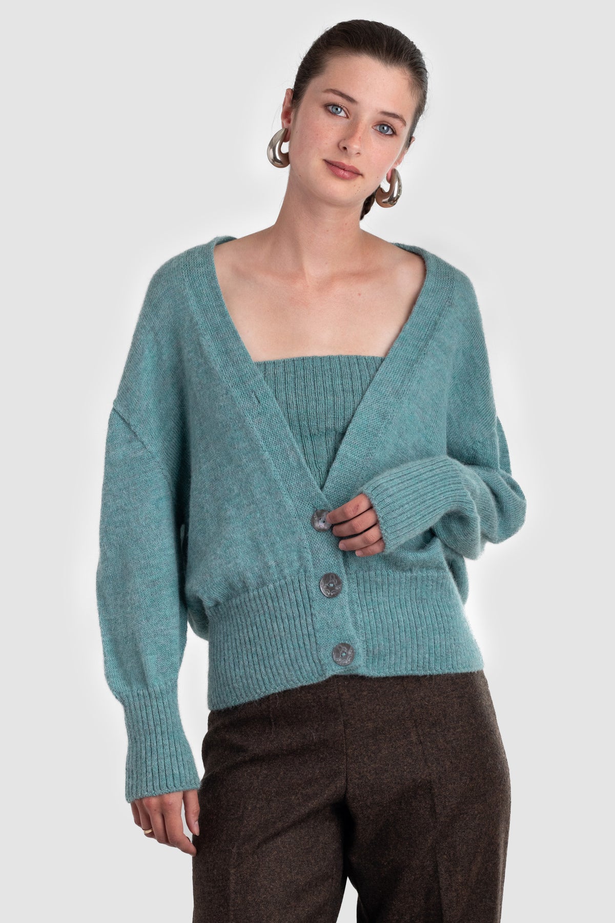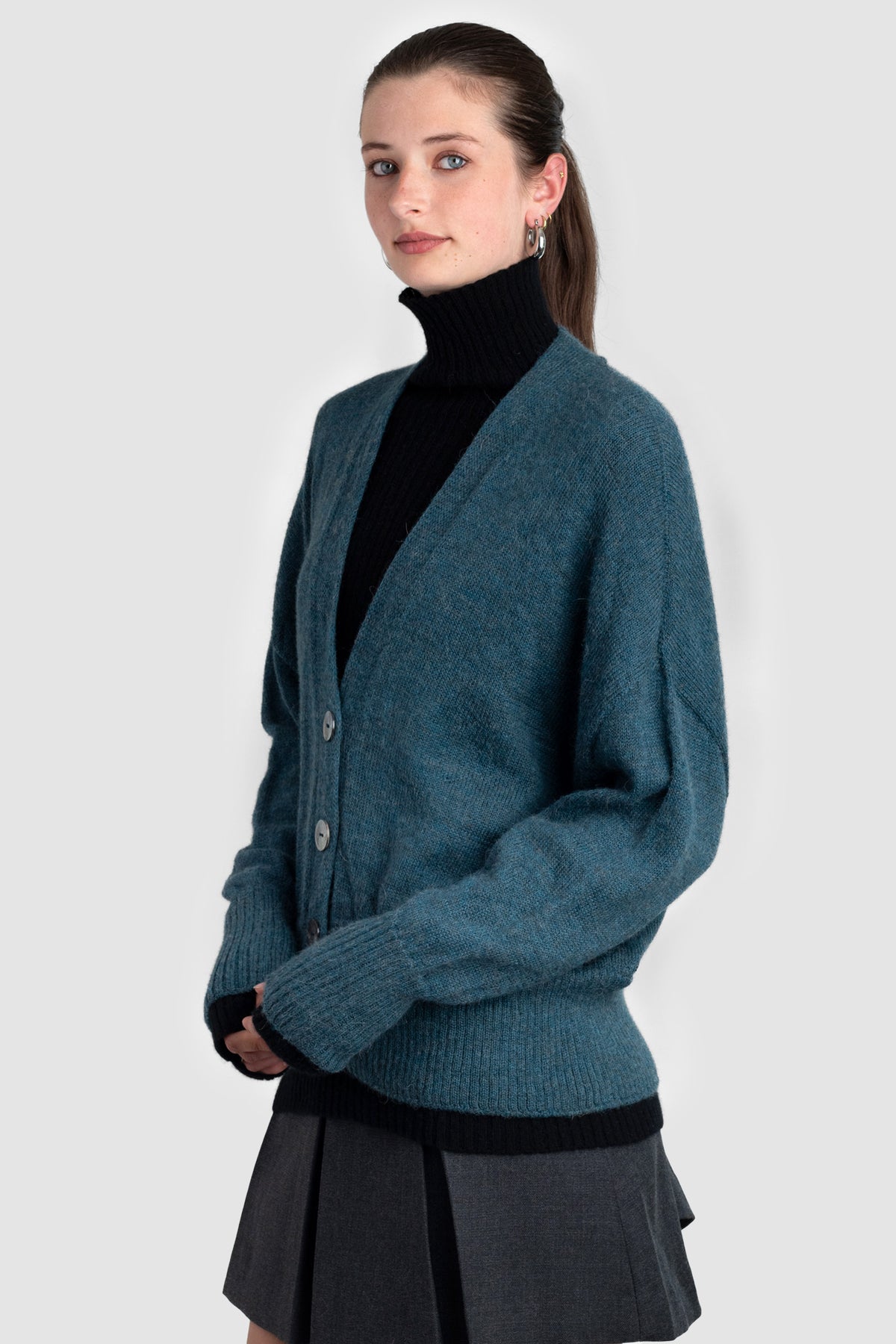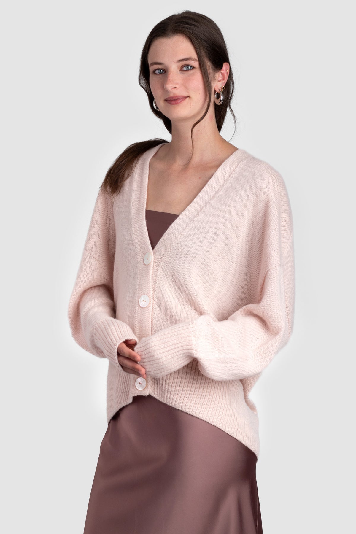 A v-neck cardigan in plain knit, with ribbing around the cuff and hem. Featuring four Ahipao mother-of-pearl stingray buttons.