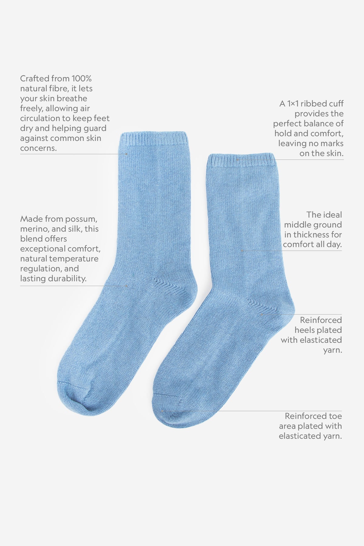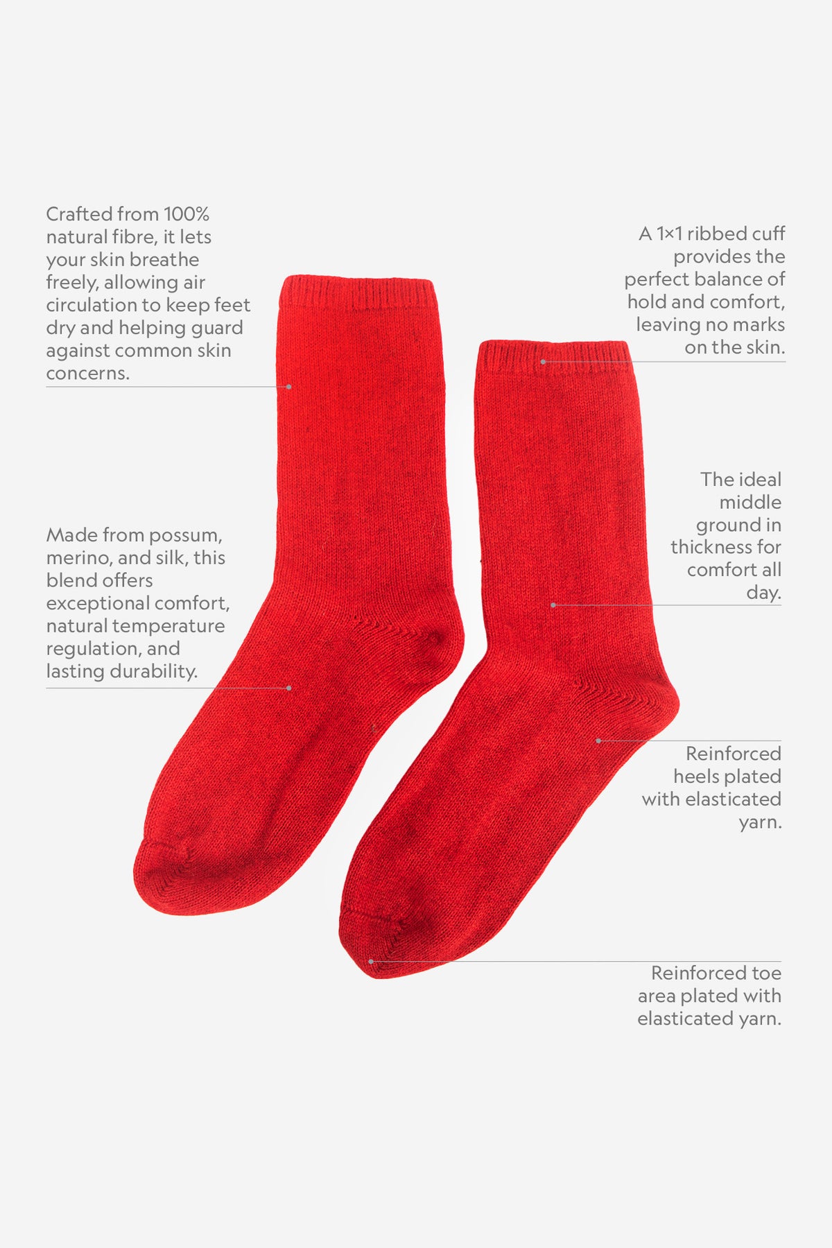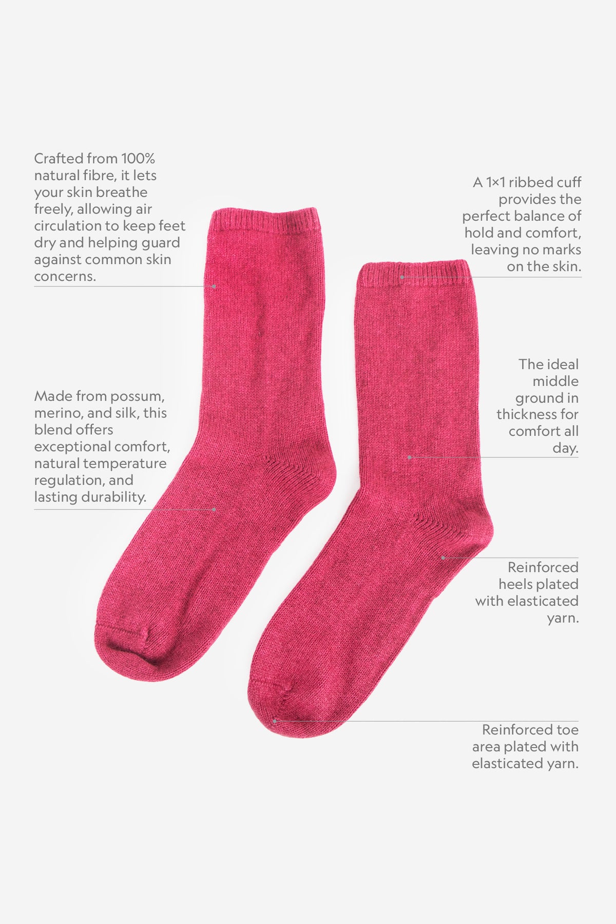 This all-natural composition delivers breathable warmth, regulates moisture naturally, and provides reinforced thickness that ensures long-lasting durability for everyday wear. The socks are offered in a carefully curated palette of colours, each brought vividly to life by the natural sheen of silk.