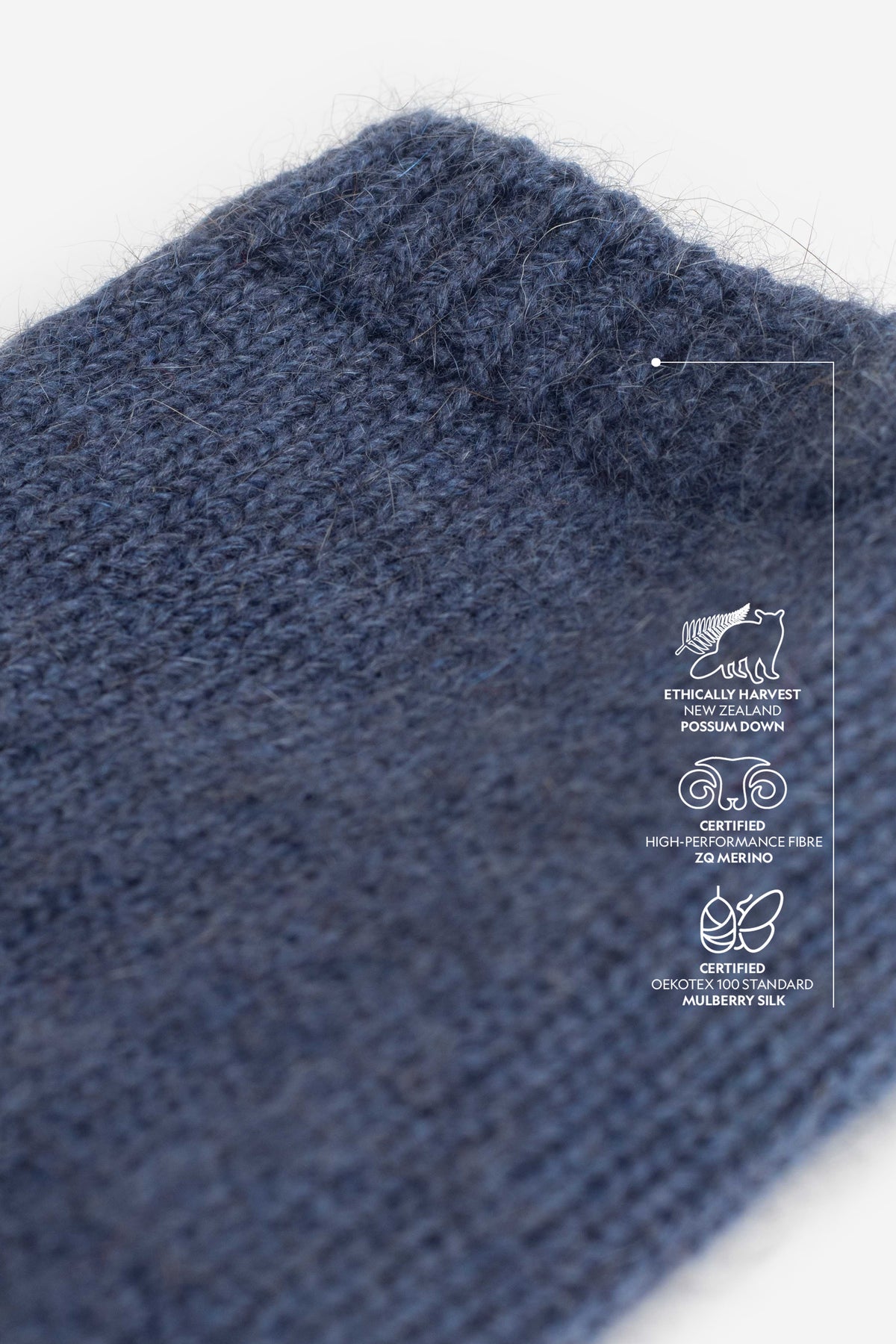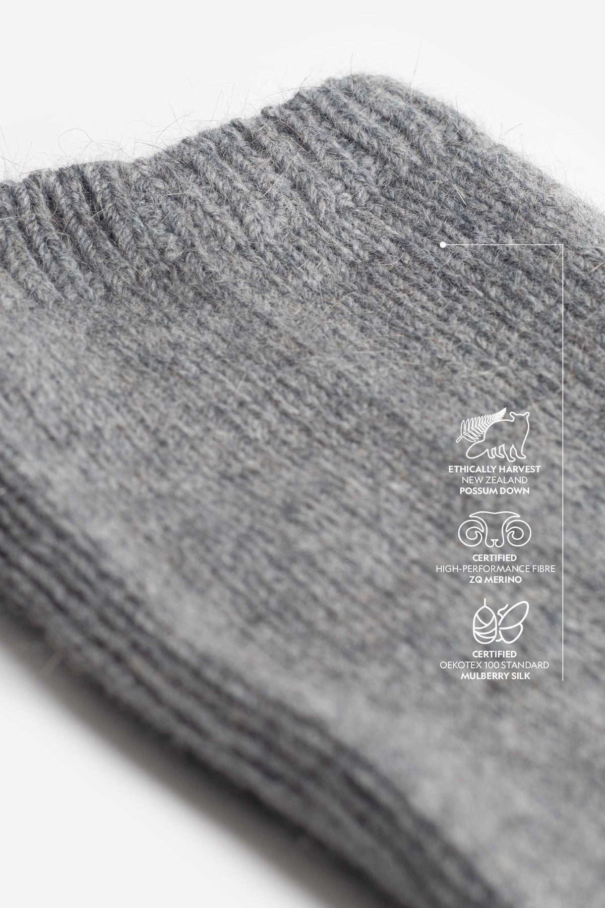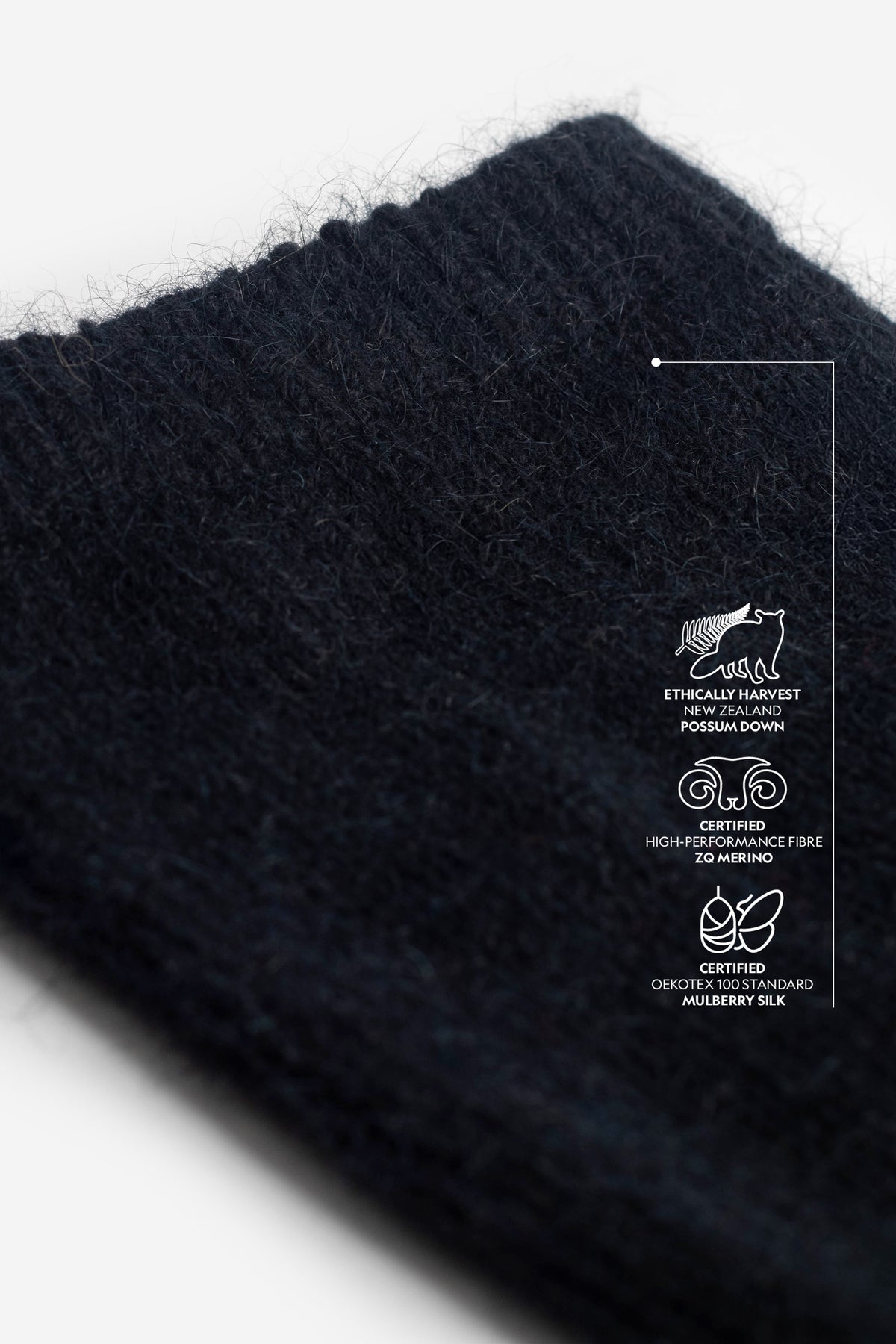 The ultrafine ZQ merino offers exceptional softness, excellent moisture management, and lasting shape retention. Brushtail possum down adds remarkable warmth, a uniquely light feel, and the signature halo effect. The addition of premium Mulberry silk, known as one of the strongest natural fibres in existence, brings unparalleled durability.