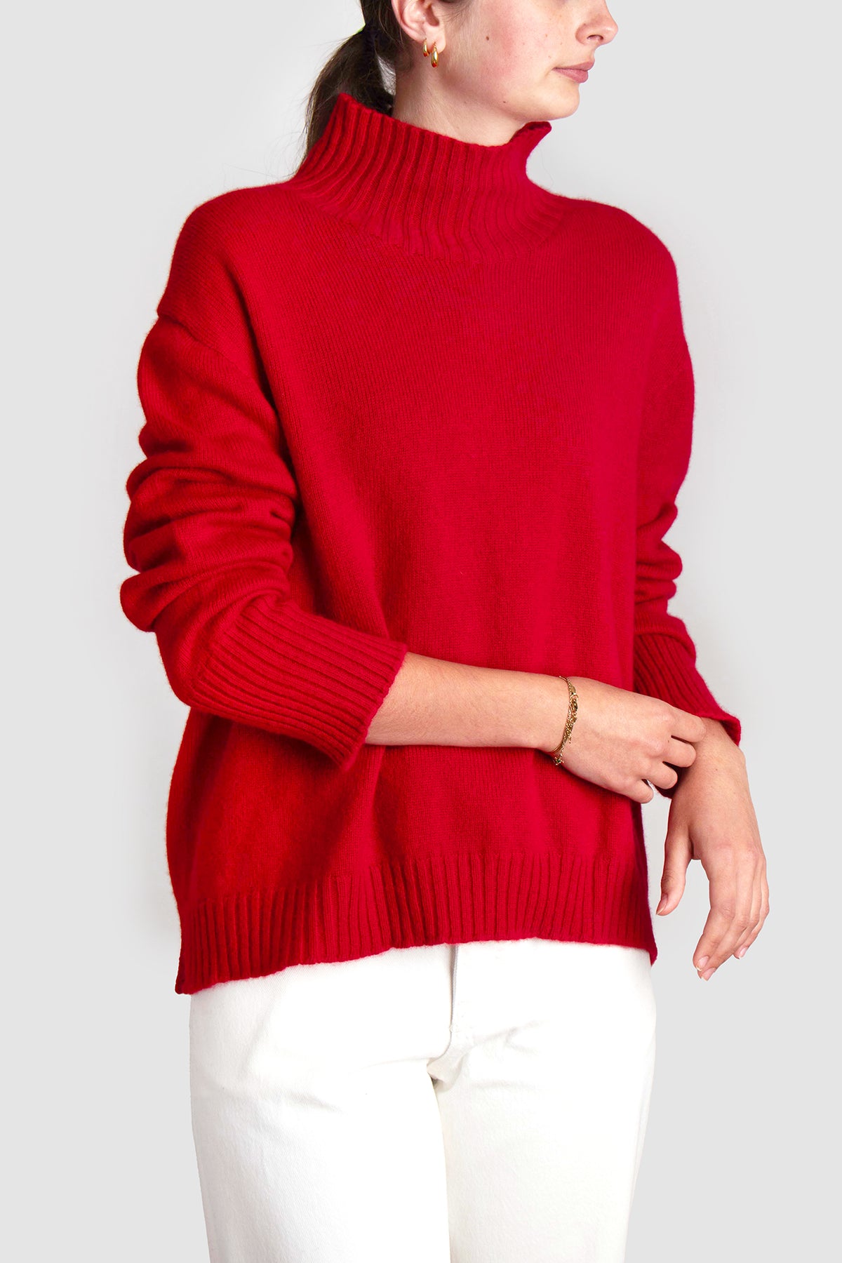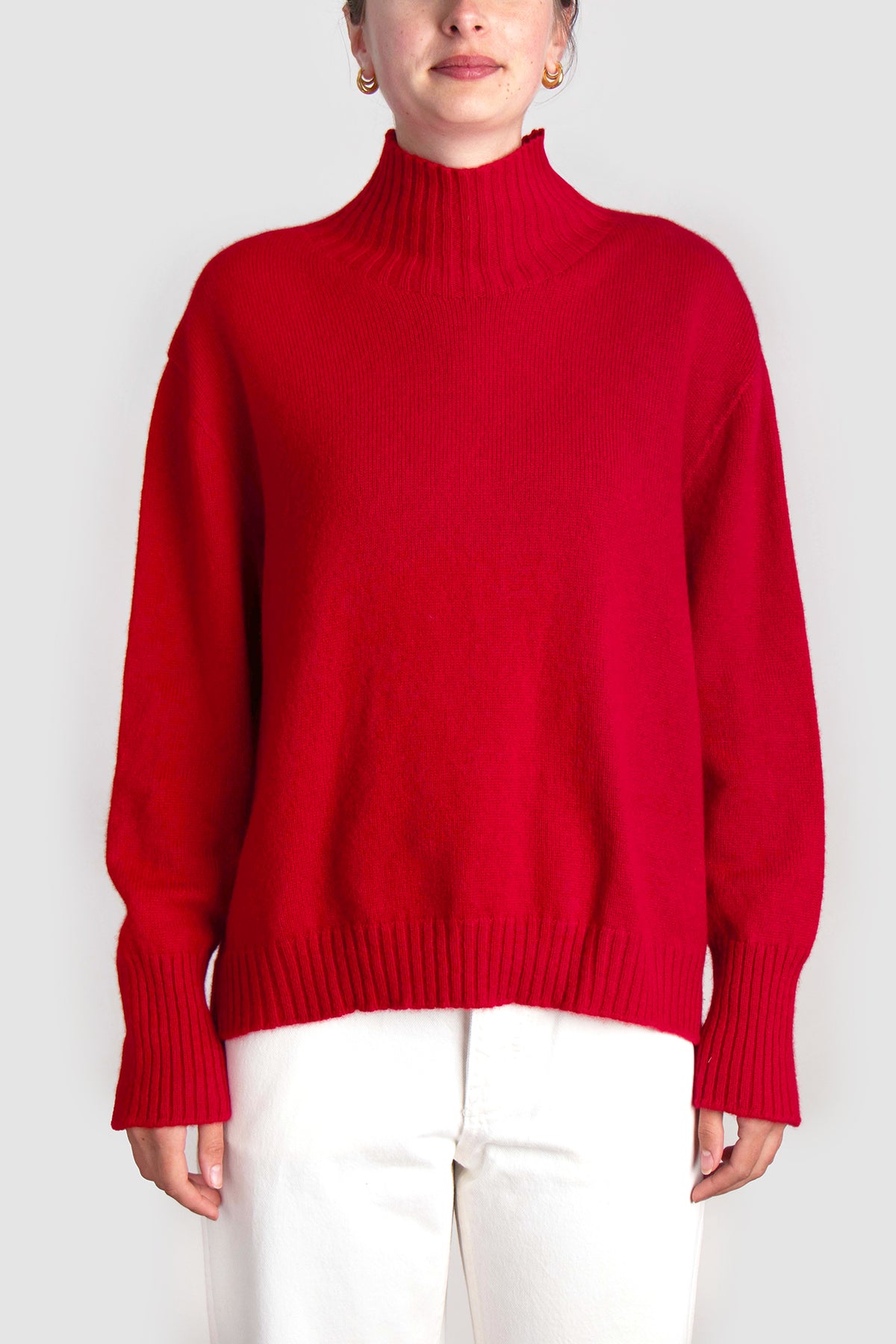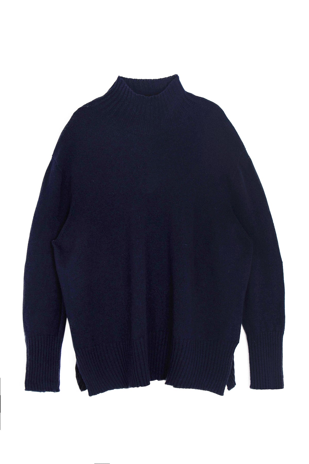 The mock neckline offers gentle structure without restriction, while wide rib detailing at the cuffs, hem, and collar introduces subtle texture and definition. Side splits at the hem create fluidity, allowing the jumper to layer effortlessly over trousers, skirts, or dresses.