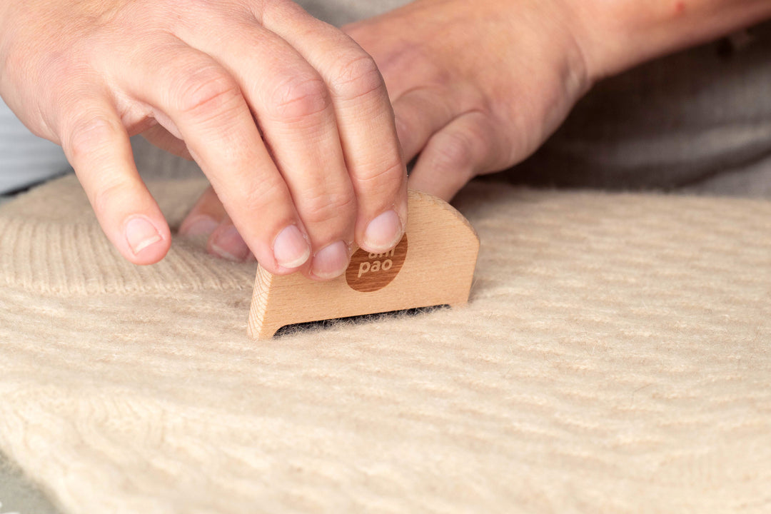 Once the garment is dry, gently remove the pills using a cashmere comb or a soft fabric shaver, always working on a flat surface. Never cut them off, as this can damage the knit.